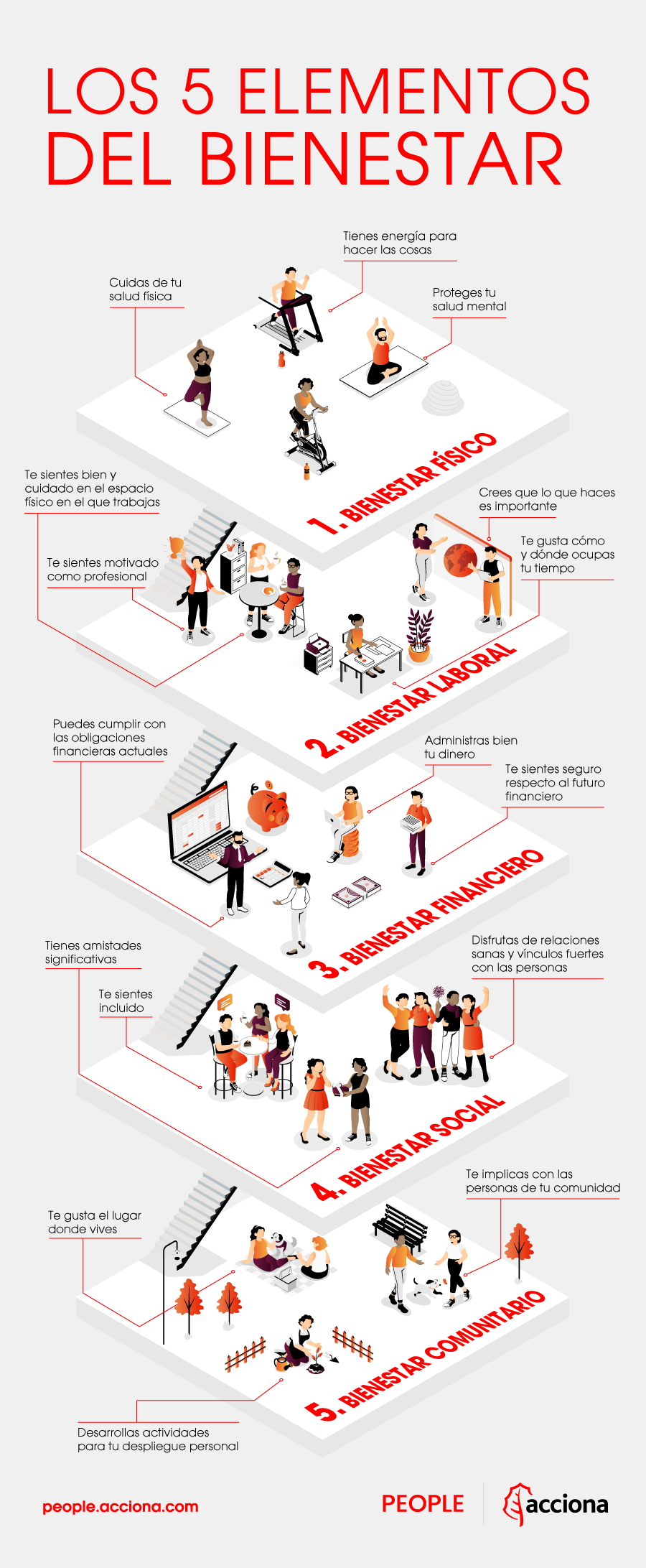 Lo mismo ocurre con las empresas. Para que la cultura organizacional prospere y alcance los mejores resultados, es necesario que ponga el foco en los cinco elementos universales del bienestar. Implicarse solo en el bienestar laboral es insuficiente, aunque será esta dimensión la que cobre más protagonismo en la estrategia.