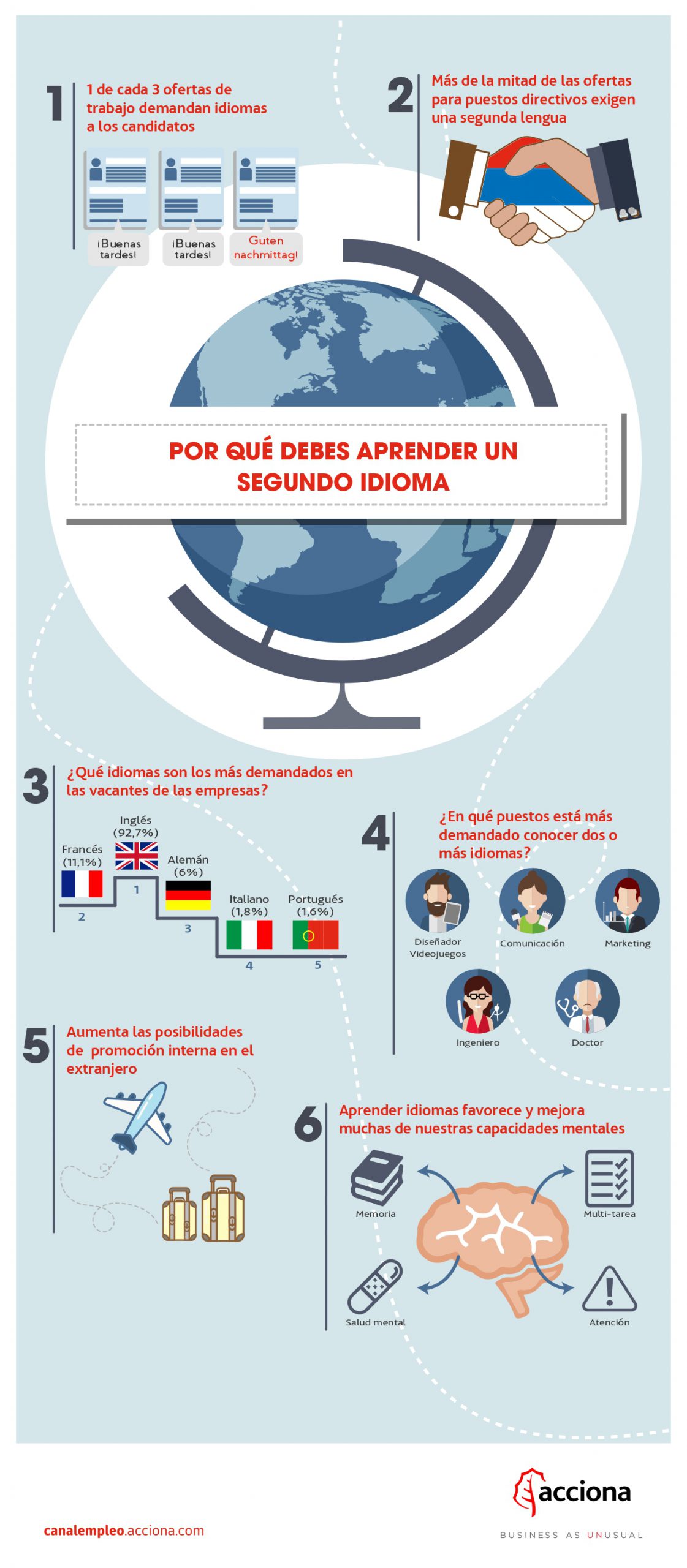 Un análisis reciente determinó que saber idiomas aumenta un 37% las posibilidades de conseguir un determinado empleo. Pero las cifras van más allá: la cuarta parte de las ofertas de empleo actuales requieren algún segundo idioma, siendo el inglés el más solicitado, junto a francés, alemán, chino y árabe. Y un 80% de los puestos de rango medio y directivo deben tener un nivel alto de un segundo idioma. El mercado laboral se vuelve cada vez más internacional, y esto requiere hablar, pensar y entender otros idiomas aparte del nativo.