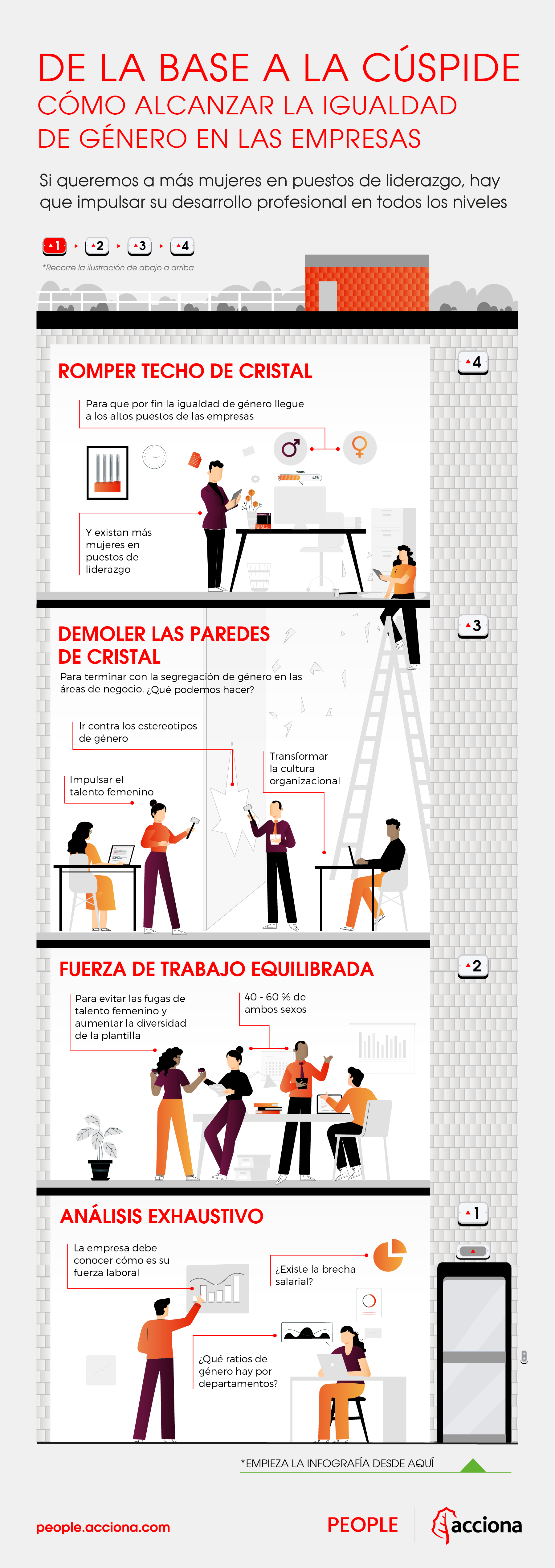 Fomentar el desarrollo profesional de las mujeres para que alcancen posiciones altas en la empresa es posible. Para lograrlo, según la OIT, hay que empezar por una fuerza de trabajo equilibrada en términos de género (40-60 % de ambos sexos). Hay un vínculo directo entre el hecho de que una mujer ocupe un puesto de dirección y la proporción de mujeres que hay en la plantilla a todos los niveles.