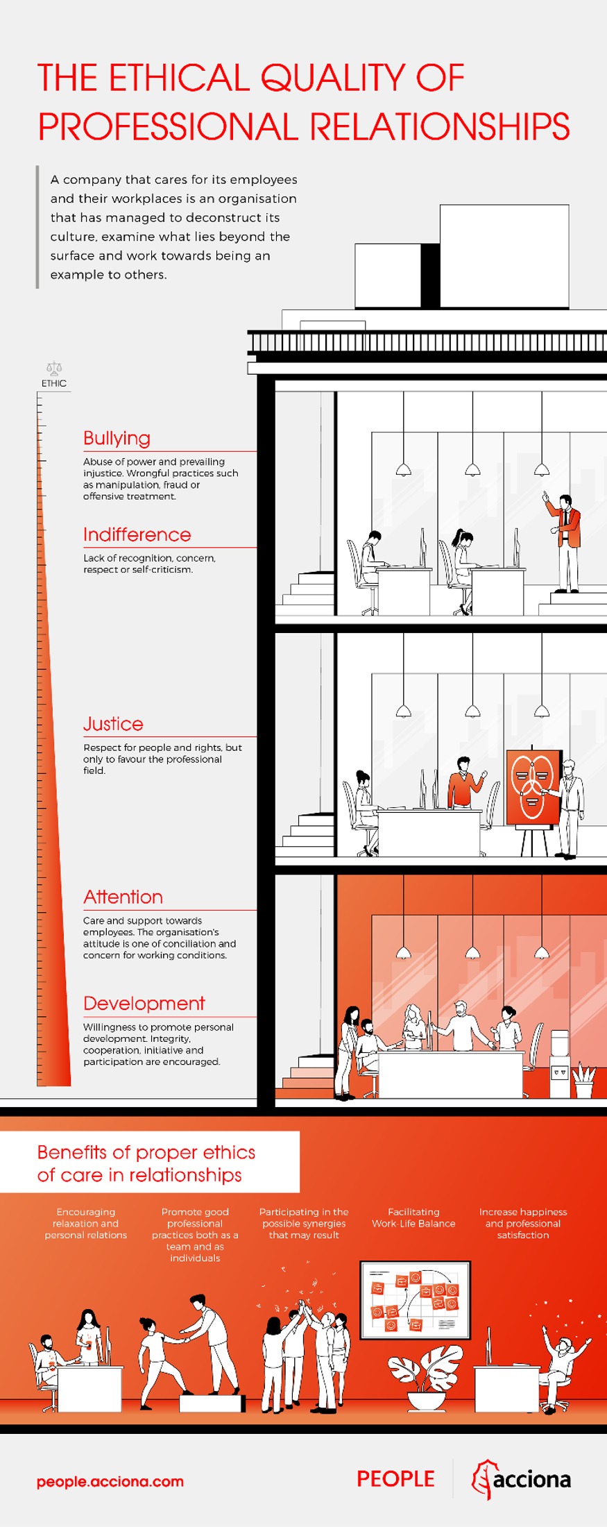 - Care. Care is at the top of relational quality. It involves a concern for people’s legitimate interests and the support necessary for problems to be solved. We find ourselves at this level when the organisation shows sensitivity in solving the problems of the people who make up the organisation, when it shows permanent concern for improving working conditions, when it shows tolerance for the faults and errors of employees, when it facilitates work-life balance and when it maintains a conciliatory attitude.