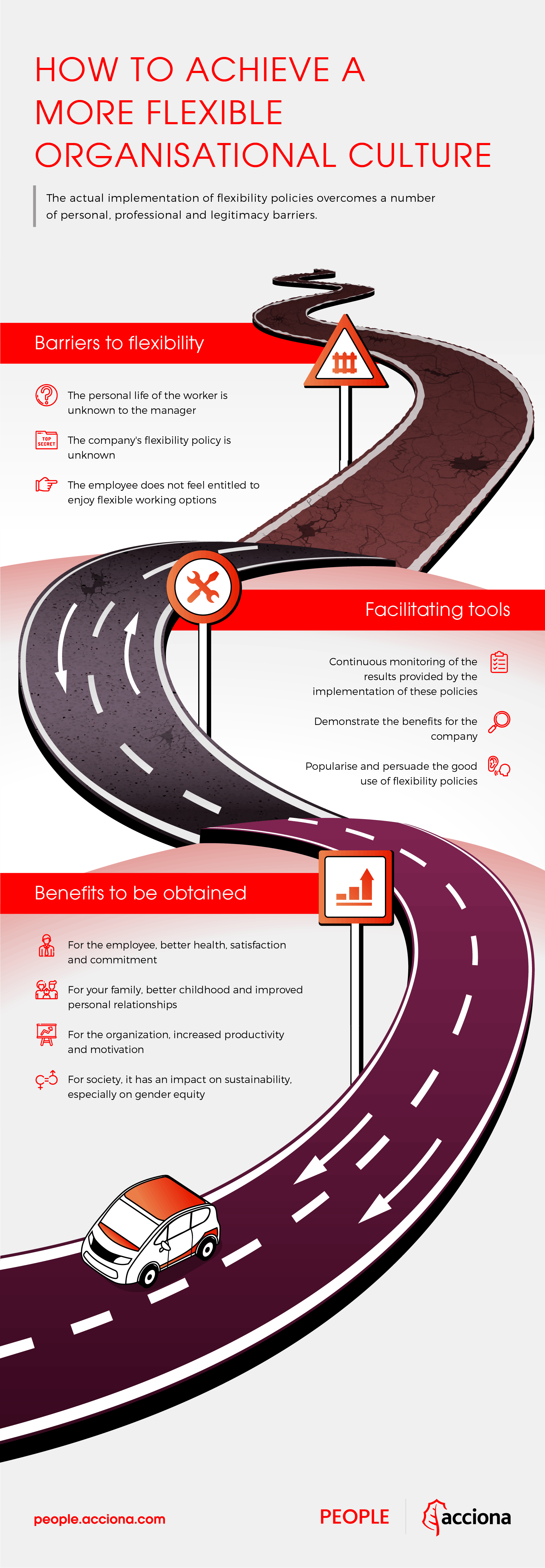 managers do. Their reactions, unconsciously influenced by the organizational culture, determine to some extent the behaviour of other colleagues in their use of flexibility policies. Thompson and her team encourage the following question: do your colleagues feel uncomfortable when a peer takes long leave of absence to take care of a newborn or family member?