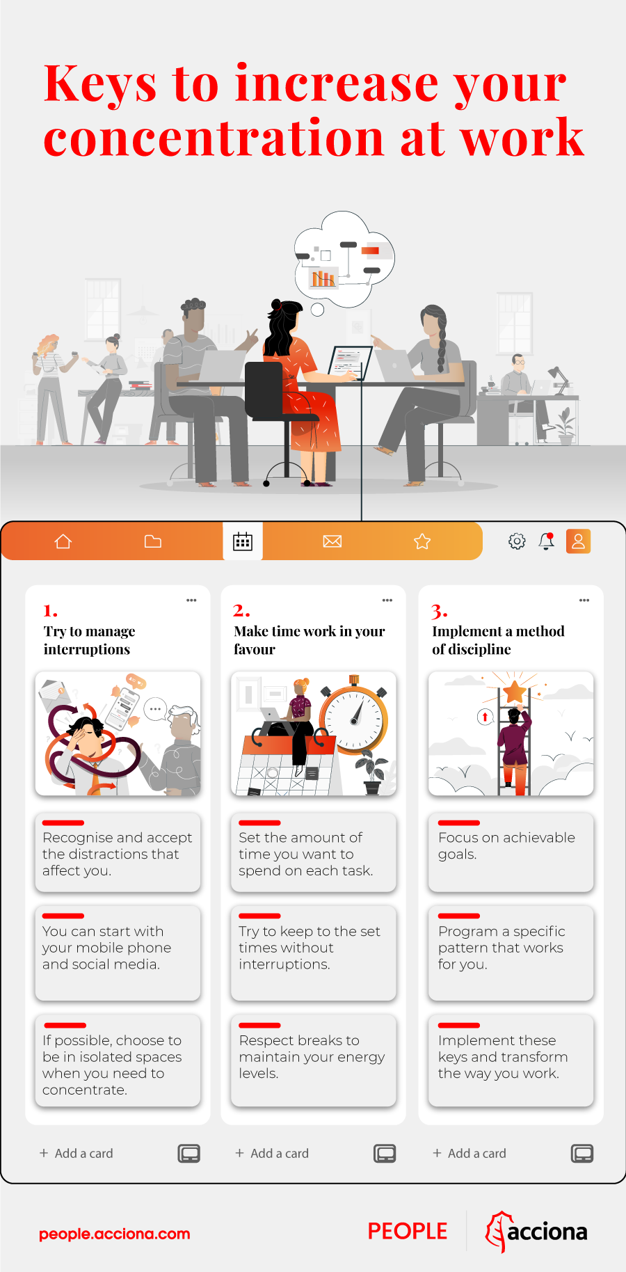 Likewise, another fundamental key is to discover, recognise and accept the distractions that people have around them. How much time do you spend looking at your mobile screen without even realising it? Picking up our device and entering a social network has become an almost automatic gesture for many of us. Mobile devices go from being, many times, a useful tool to an obstacle for our concentration levels at work.