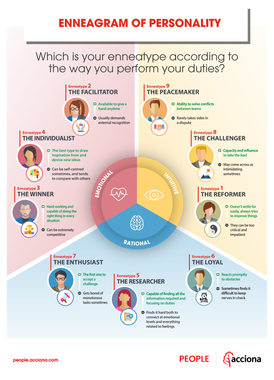 Hudson and Riso devised nine enneatypes that determine your professional profile. We’re going to classify them into three groups and define some of the professional features of each one of them. Enneatypes are extremely complex and their behaviour is defined, to a great extent, by the relationship among them. No enneatype is better than the next, and even if we fit better into a certain one, we all have some professional skills from the remaining eight.